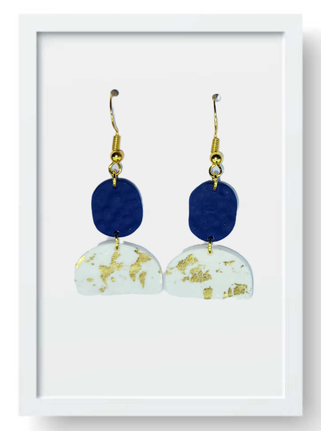 Navy Oval and White Half Circles - Handmade Polymer Clay Earrings