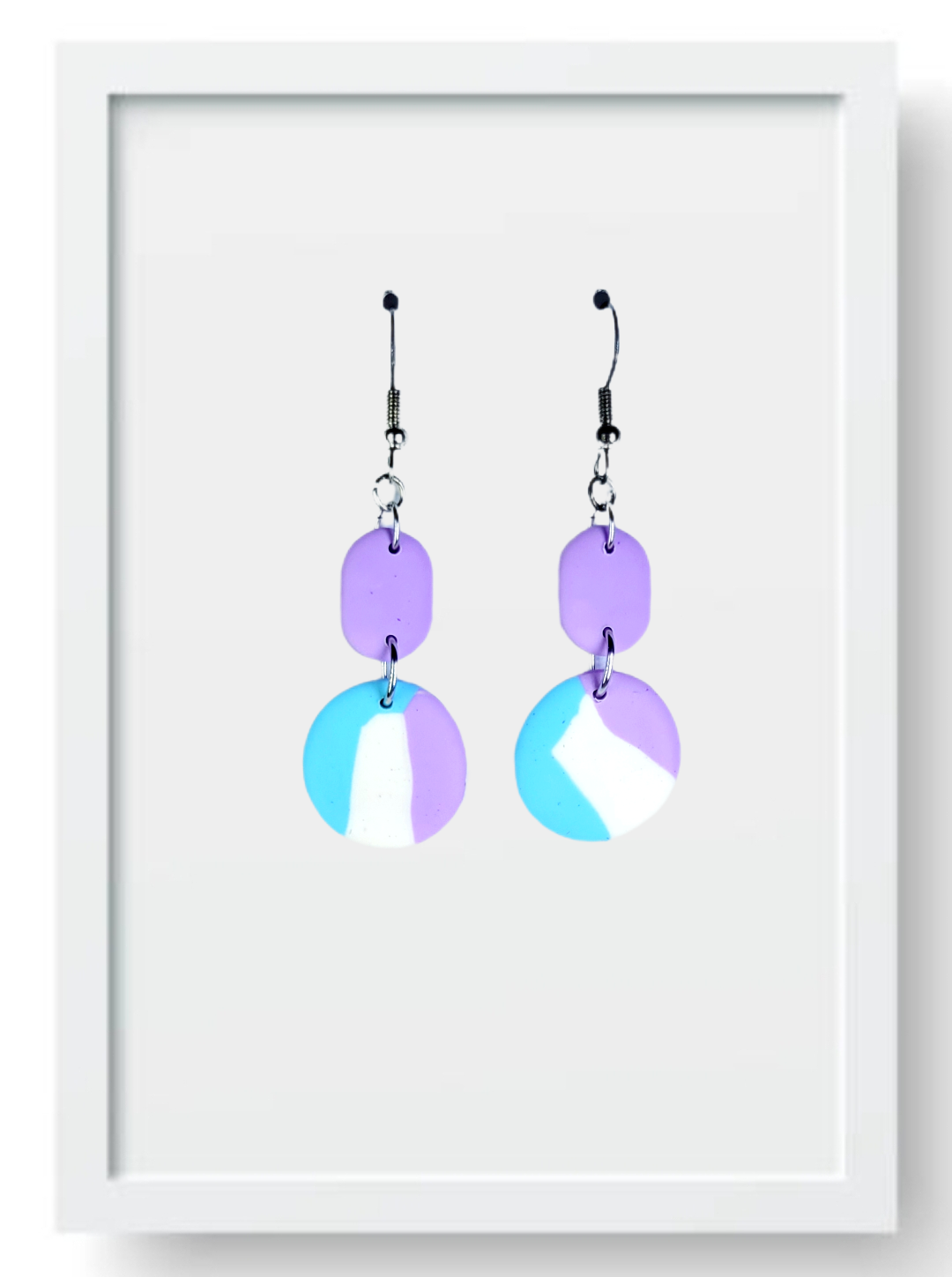 Pastel Purple Oval with Pastel Blue, White, Purple Circles - Handmade Polymer Clay Earrings